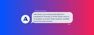 For example, your headquarters might notify guests two days in advance with directions and parking details, while a smaller office could send a simple reminder one hour before the meeting. AskCody automatically takes care of both email and SMS for all visitors registered through the Visitors add-in for Outlook. If a visitor is added after your chosen window (for instance, if the setting is three days before and the visitor is added one day before), they will simply receive the message immediately.